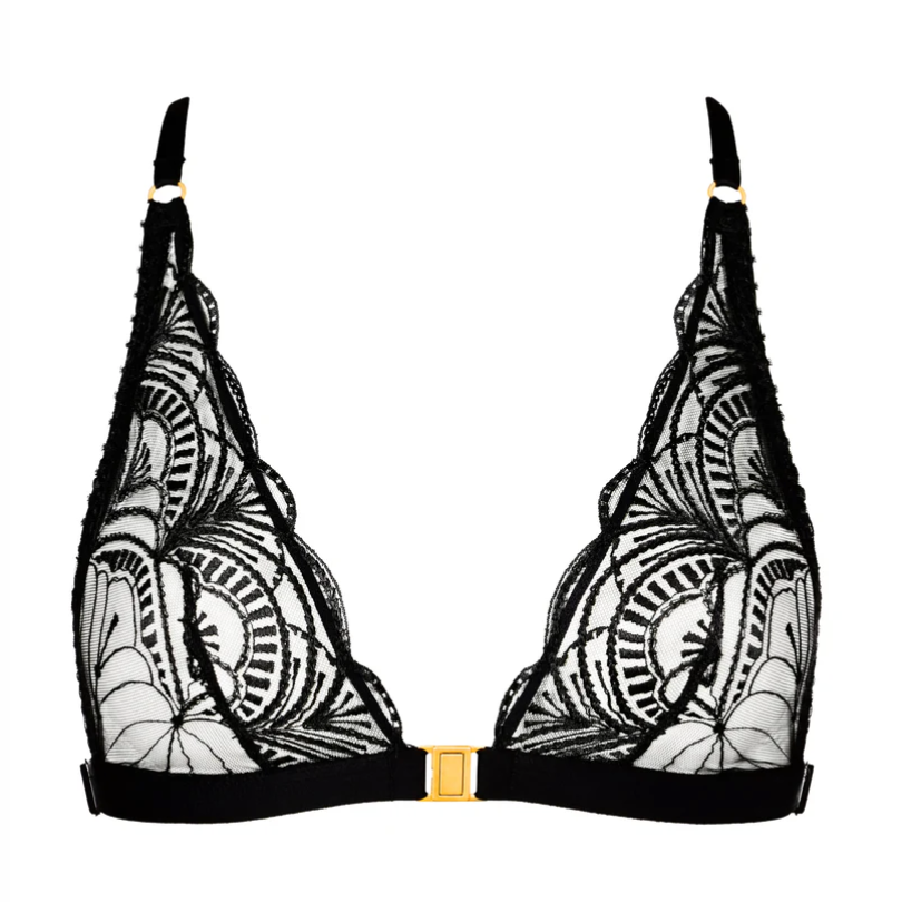 The Aubade Vibes bralette reimagines modern intimacy with refined sensuality. This non-underwired triangle style features intricate Bohemian embroidery with a delicate gold jewel pendant at the center, creating an eye-catching focal point. The graphic mesh panel showcases the embroidery's curves while offering subtle transparency for an effortlessly erotic aesthetic.