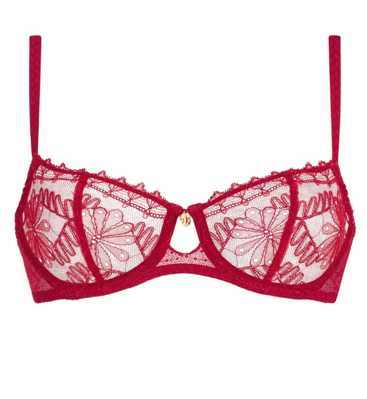 Aubade's Mystery of Love underwired demi bra enhances the décolletage with its shaping design and delicate embroidery. In vibrant cherry red, it embodies French elegance and sensuality.