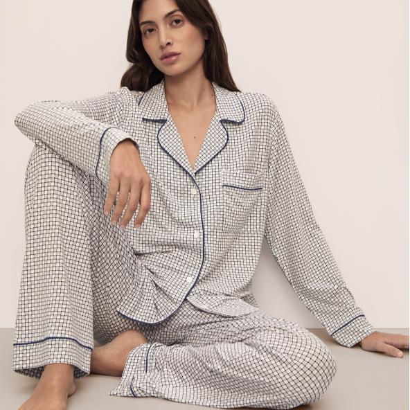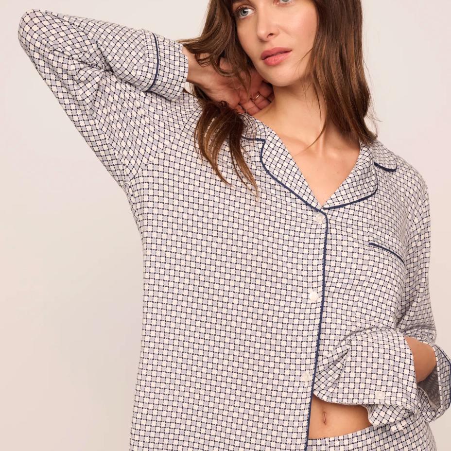 The original PJ set that launched the Eberjey love! Crafted from ultra-soft TENCEL™ Modal with a hint of elastane, this fabric is OEKO-TEX® Standard 100 certified for safe, non-toxic dyes. This chill long-sleeve set boasts playful contrast piping, a button-up top with a notch collar and handy pocket, plus comfy low-rise straight-leg pants with a slim elastic waistband. Perfect for pairing with your favorite lingerie or catching some blissful ZZZ’s in style.