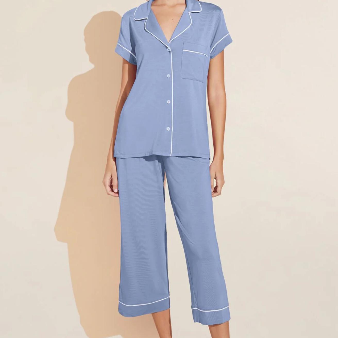 Matching pajama set with a short-sleeve top and cropped pant made from ultra-soft knit fabric with contrast piping.