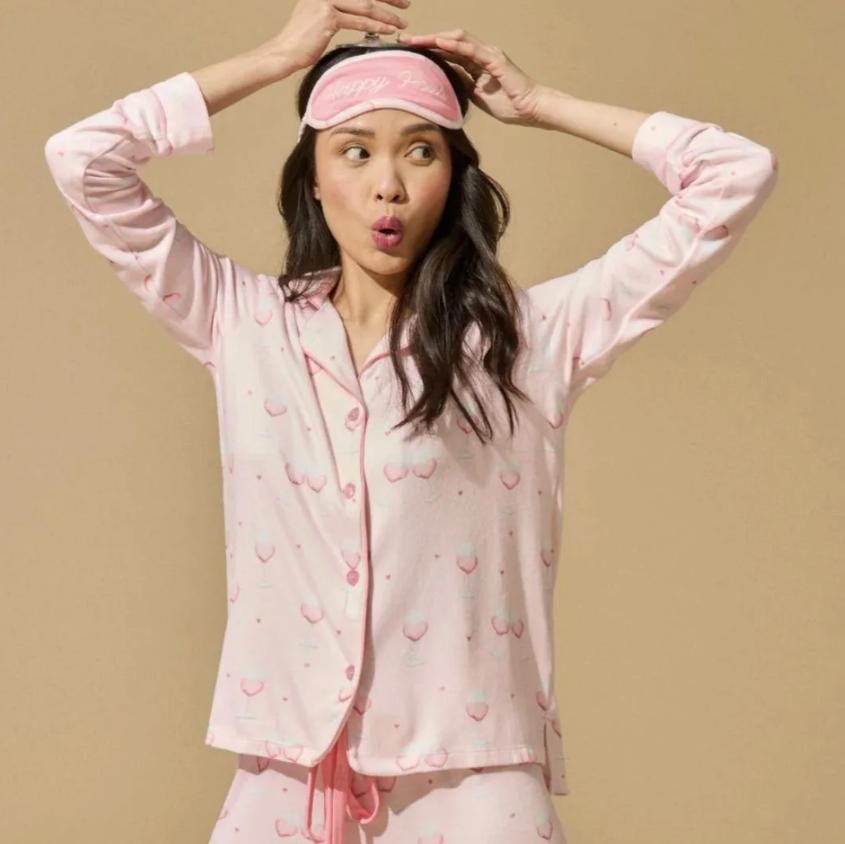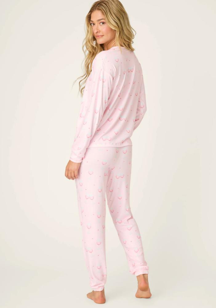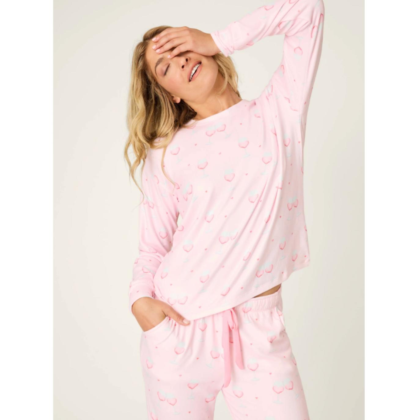 Slip into comfort and whimsy with the PJ Salvage Happy Hour PJ Set. This charming long sleeve top pairs perfectly with matching jogger pants, creating the ultimate cozy ensemble for lounging at home. Featuring a delightful light pink palette adorned with wine glasses brimming with love, this set celebrates the joy of relaxation and self-care. The playful design reminds you that happiness comes in many forms—whether you're unwinding after a long day, enjoying a girls' night in, or simply treating yourself to some well-deserved downtime. Soft, breathable fabric keeps you comfortable from dusk till dawn, while the relaxed fit ensures effortless style. Perfect for gifting to the wine-loving friend who appreciates humor and comfort in equal measure.