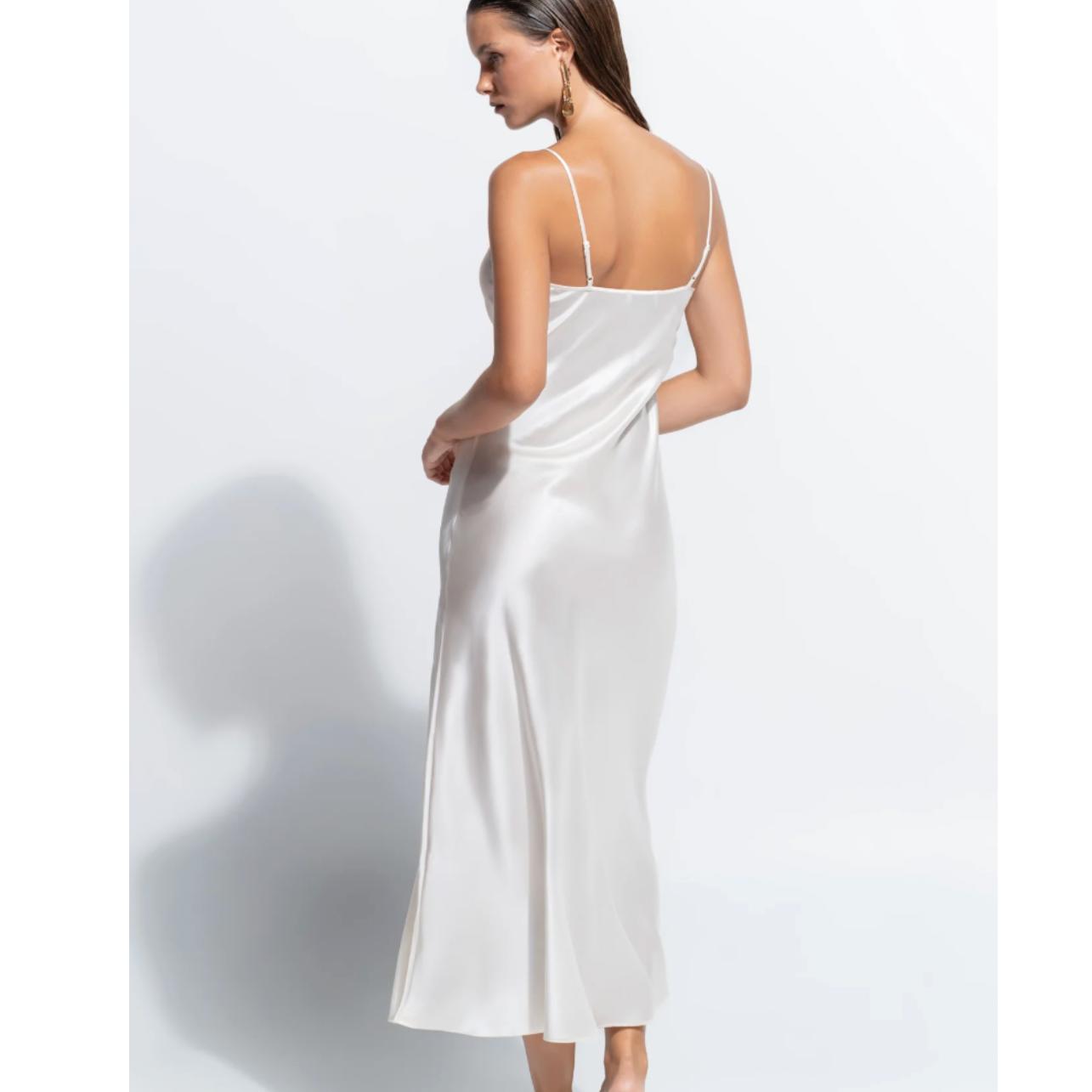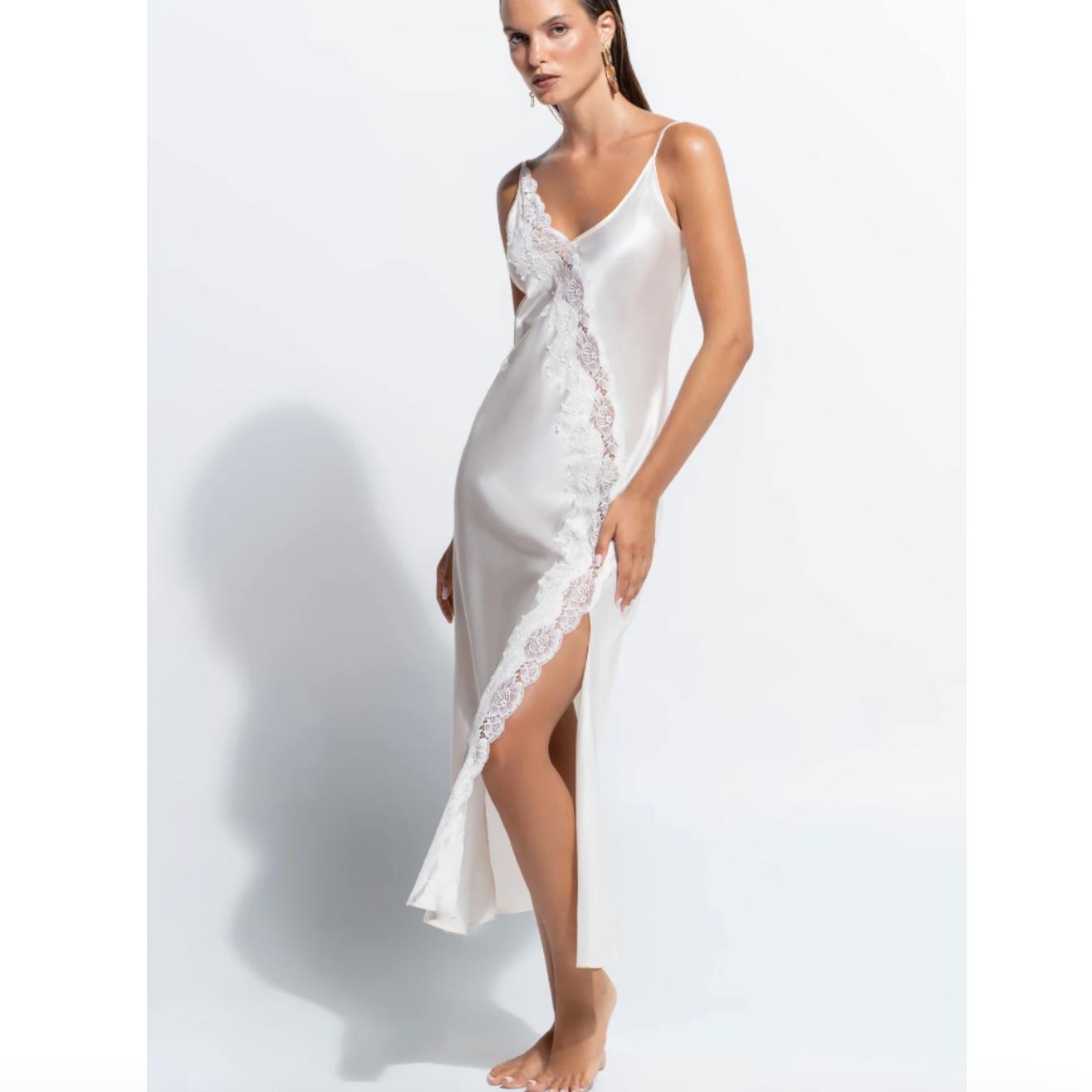 The Jezebel Slip is crafted from a luxurious silk–cotton blend, offering an effortlessly lightweight and breathable feel against the skin. Falling to a flattering mid-calf length, it features a front split adorned with asymmetrical lace detailing for a romantic, elevated finish. Blending timeless femininity with contemporary ease, the Jezebel Slip is perfect for relaxed lounging or effortless layering.