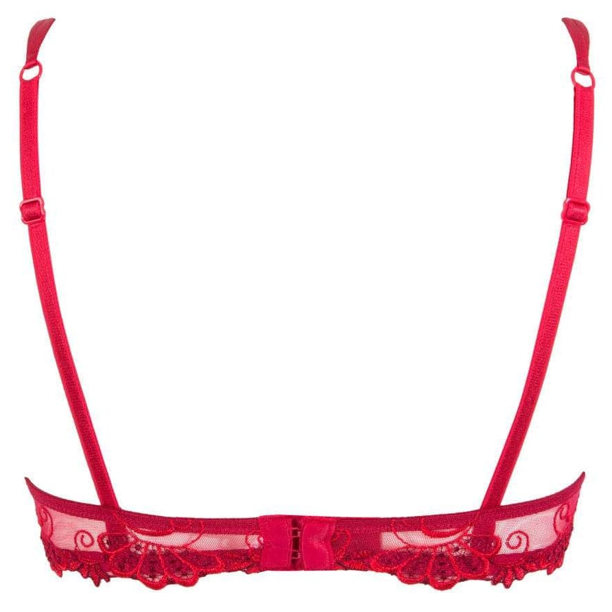 A beautiful demi cup bra with horizontal stitching. This bra offers a curved cleavage full of feminity. The spaghettis straps are thin & adjustable for more lightness and feminity. Guipure yokes for tatoo effect on the cups and at the back panel. Refined Swarovski necklet as a finishing touch.