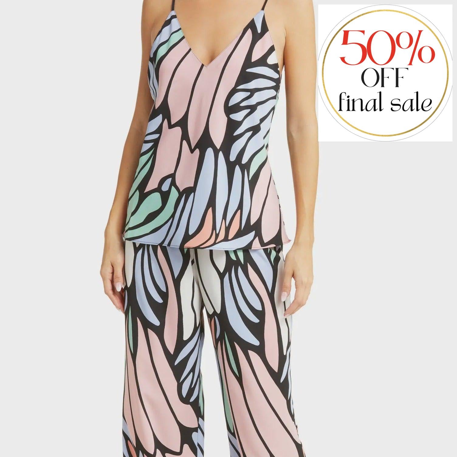 A bold and bright print covers this luxe pajamas in a matte, wrinkle-resistant fabric perfect for everyday wear.
