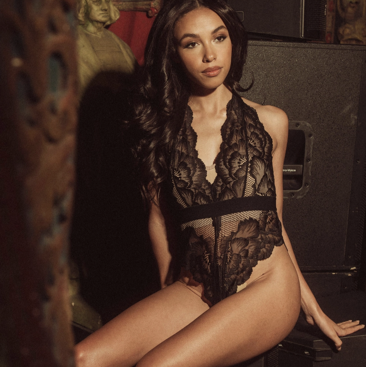 Kilo Brava’s top-selling teddy features irresistibly soft black floral fishnet lace with a satin ribbon tie at the nape. It has a cotton gusset, brushed elastic waist, and a cheeky back cut. Crafted from stretchy nylon and elastane with scalloped edges and a plunging V-neckline, it’s designed to dazzle. Tie styling adds a flirty touch. Hand wash recommended. Made to celebrate all body types, this piece delivers comfort, sensuality, and timeless charm with artisan craftsmanship.