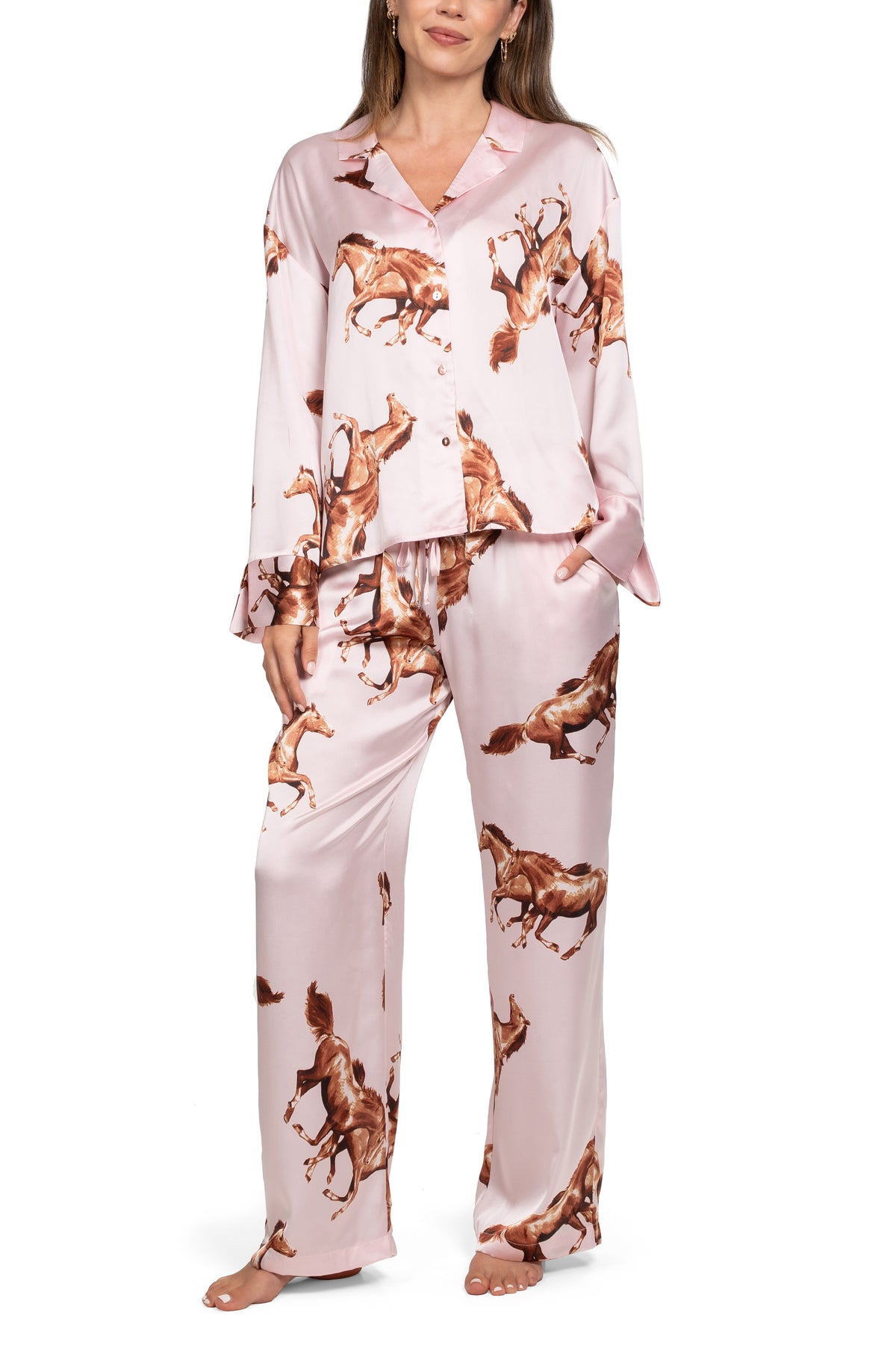 Chic, cozy, and made for dreamers. The Wild Horses set brings effortless charm to your nighttime routine. Crafted from soft, lightweight fabric, this relaxed-fit set features a button-down top and matching pants adorned with a whimsical wild horse print that adds a playful touch to your loungewear look.
