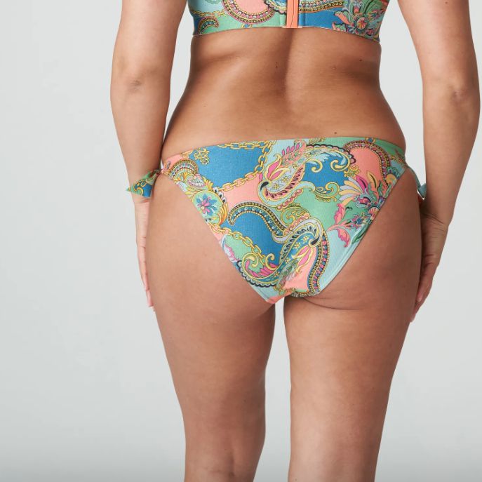 Playful bikini briefs with bows on the side, made of shiny fabric. You can tie the ropes at the sides, either at the waist or at the hips. This way you choose your look and it also makes for a perfect fit. Italian Chic is a paisley print in soft shades of green, blue and coral. It has a luxurious sheen and looks very stylish.