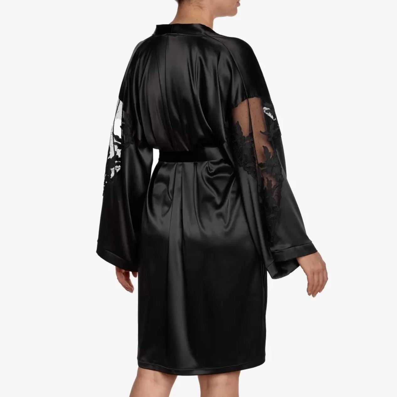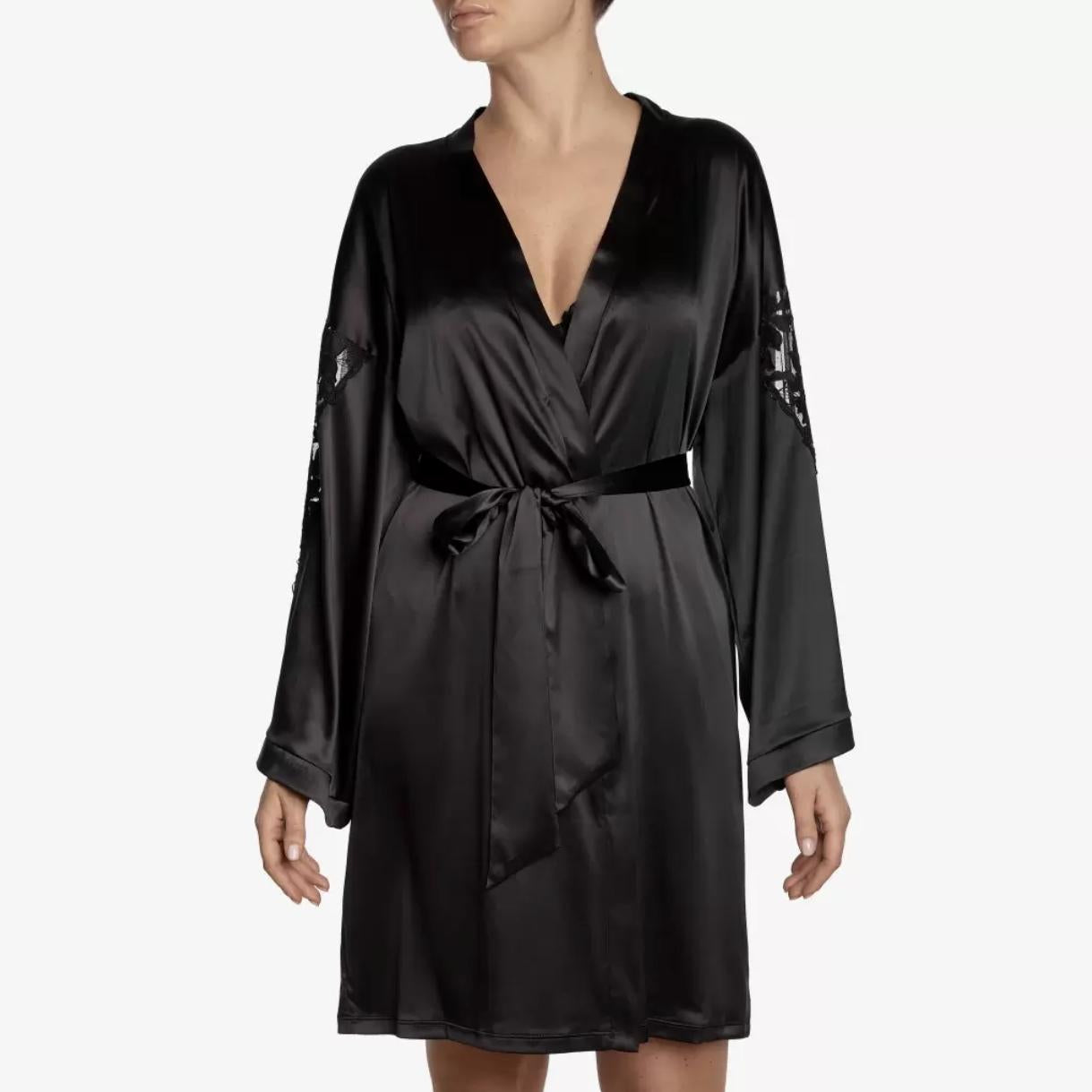 Meet your new loungewear obsession—a chic black satin robe that proves comfort doesn't have to compromise on style. Draped in a relaxed silhouette, it hugs you with whisper-soft elegance while those show-stopping wide sleeves steal the spotlight with sheer mesh panels and intricate floral details. The mini cut celebrates your legs, and the cinch belt gives you total control over how you want to wear it. Blended from polyamide, elastane, viscose, and polyester, this is the robe that makes staying home feel like a luxury escape.