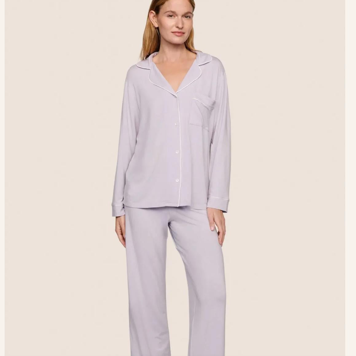 The Gisele Long PJ Set represents Eberjey's signature approach to intimate sleepwear—timeless design meets responsible craftsmanship. This set features a luxurious blend of TENCEL™ Modal and elastane, certified by OEKO-TEX® Standard 100 for safety and sustainability. The relaxed silhouette includes a button-front top with notch collar and functional pocket, paired with low-rise straight-leg pants and refined contrast piping. Whether layered beneath your lingerie collection or worn solo for an evening of understated comfort, this set delivers the softness and elegance Eberjey is known for. Machine wash cold; tumble dry low.