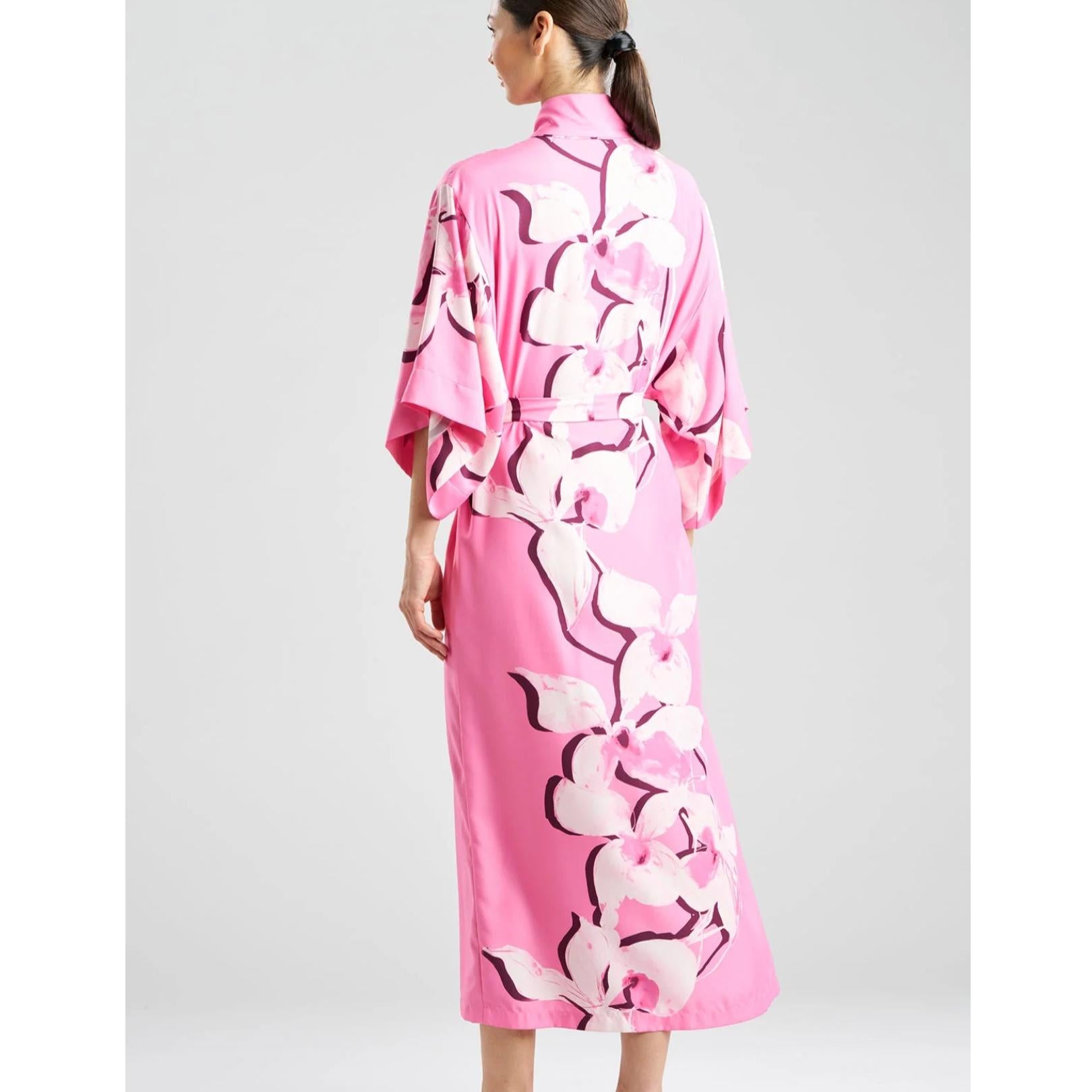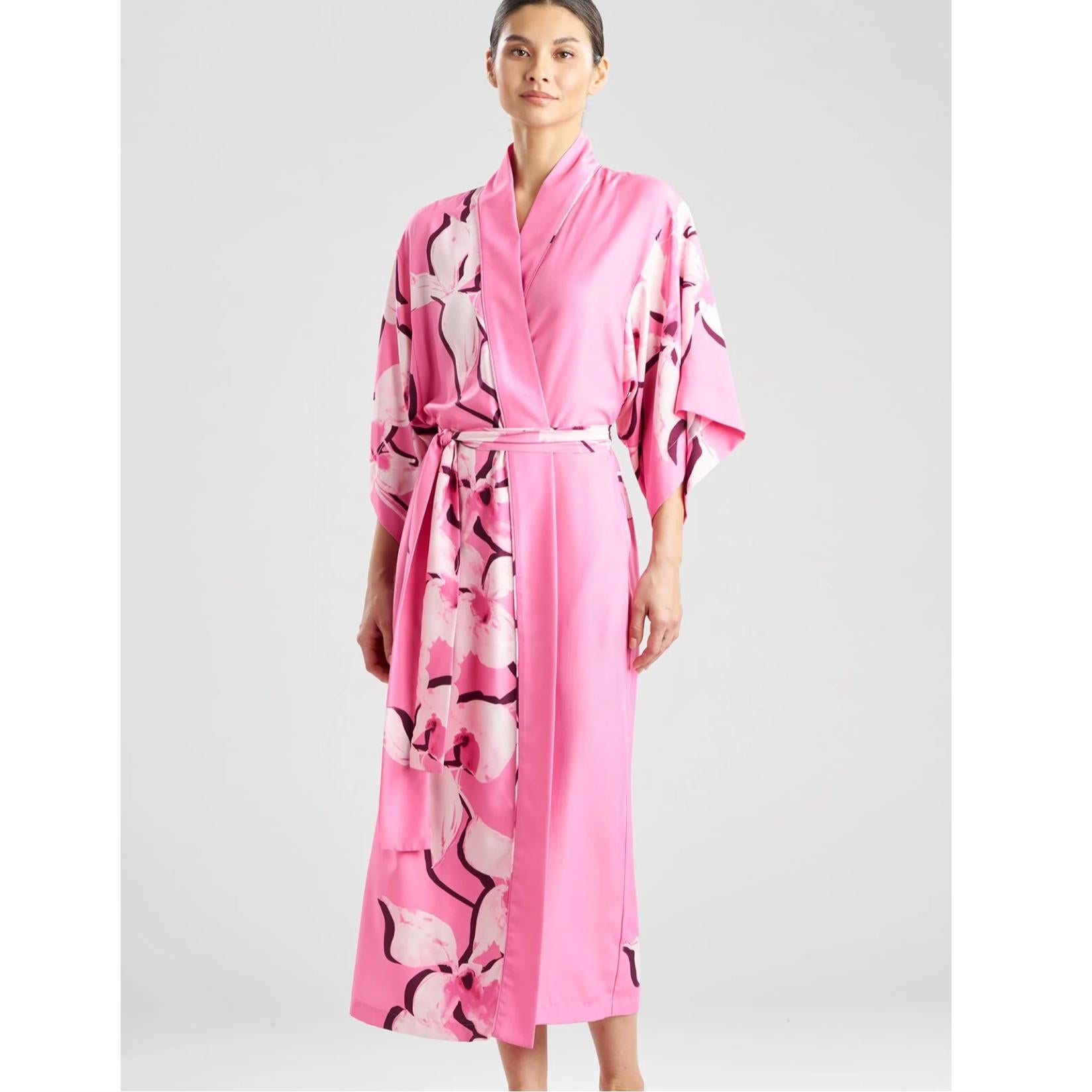 Natori's Orchida robe brings understated elegance to your intimate wardrobe. Crafted from soft satin in a timeless 52" length, this piece features a delicate orchid-inspired print in a flattering tulip hue. The wrinkle-resistant polyester fabric drapes beautifully while remaining practical for everyday wear, pairing seamlessly with coordinating slip dresses. Designed and manufactured at Natori's own Philippine facilities, this classic silhouette embodies quality craftsmanship and refined simplicity.