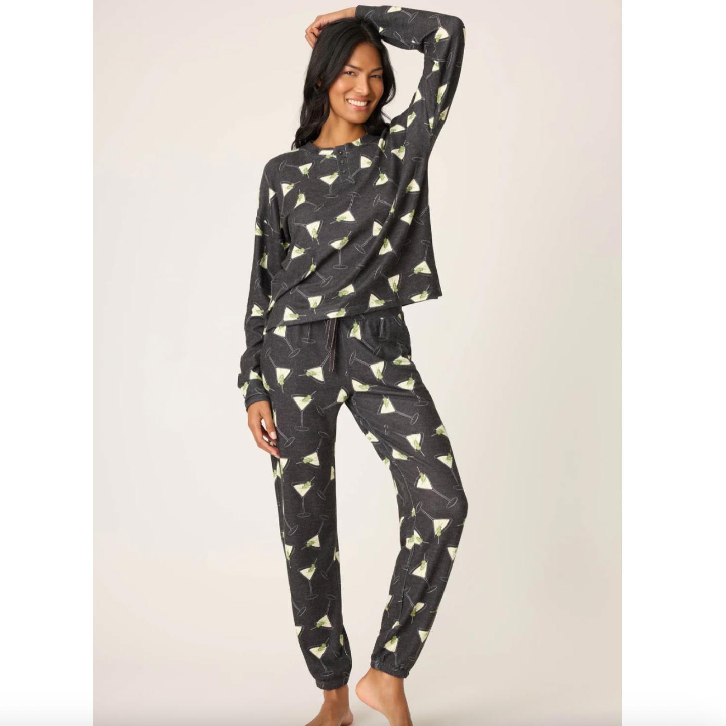 Celebrate the holidays in style with this whimsical two-piece pajama set from PJ Salvage. Featuring a cheerful martini glass design adorned with green olives, it's the perfect festive touch for cozy evenings. The set pairs a relaxed long-sleeve top with comfortable drawstring joggers, all crafted from luxuriously soft knit fabric that feels as good as it looks. Ideal for holiday lounging or gifting to the cocktail lover in your life.