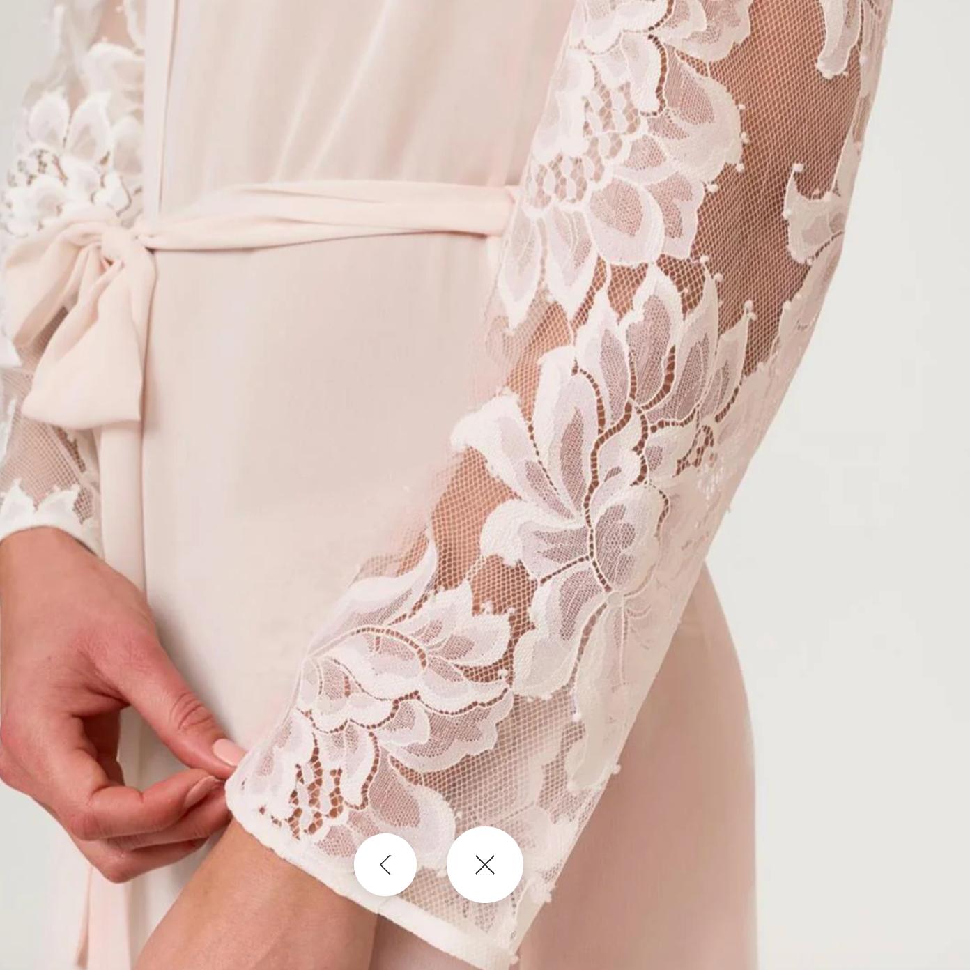 The Rya Collection Royale Robe in Blush is your bridal essential—a timeless piece that brings elegance to every moment. Crafted from luxurious 100% nylon chantilly lace paired with silky polyester chiffon, it features beautifully sculpted set-in sleeves and a graceful scalloped neckline that frames the shoulders with intricate lace detailing. The coordinating belt cinches effortlessly for a polished silhouette. Ethically made and designed to last, this robe transitions seamlessly from getting-ready to celebration. Hand wash cold and lay flat to dry to keep it pristine.