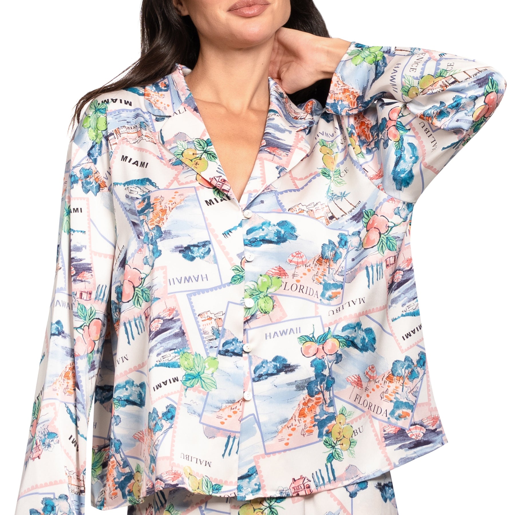 Step into bedtime with a wink of whimsy in the Georgia Pajama Set, adorned with a charming postcards print. Soft, buttery fabrics meet a relaxed yet tailored fit, turning every evening into a playful escape. From cozy nights in to slow, indulgent mornings, this set makes lounging feel effortlessly stylish, and delightfully fun.