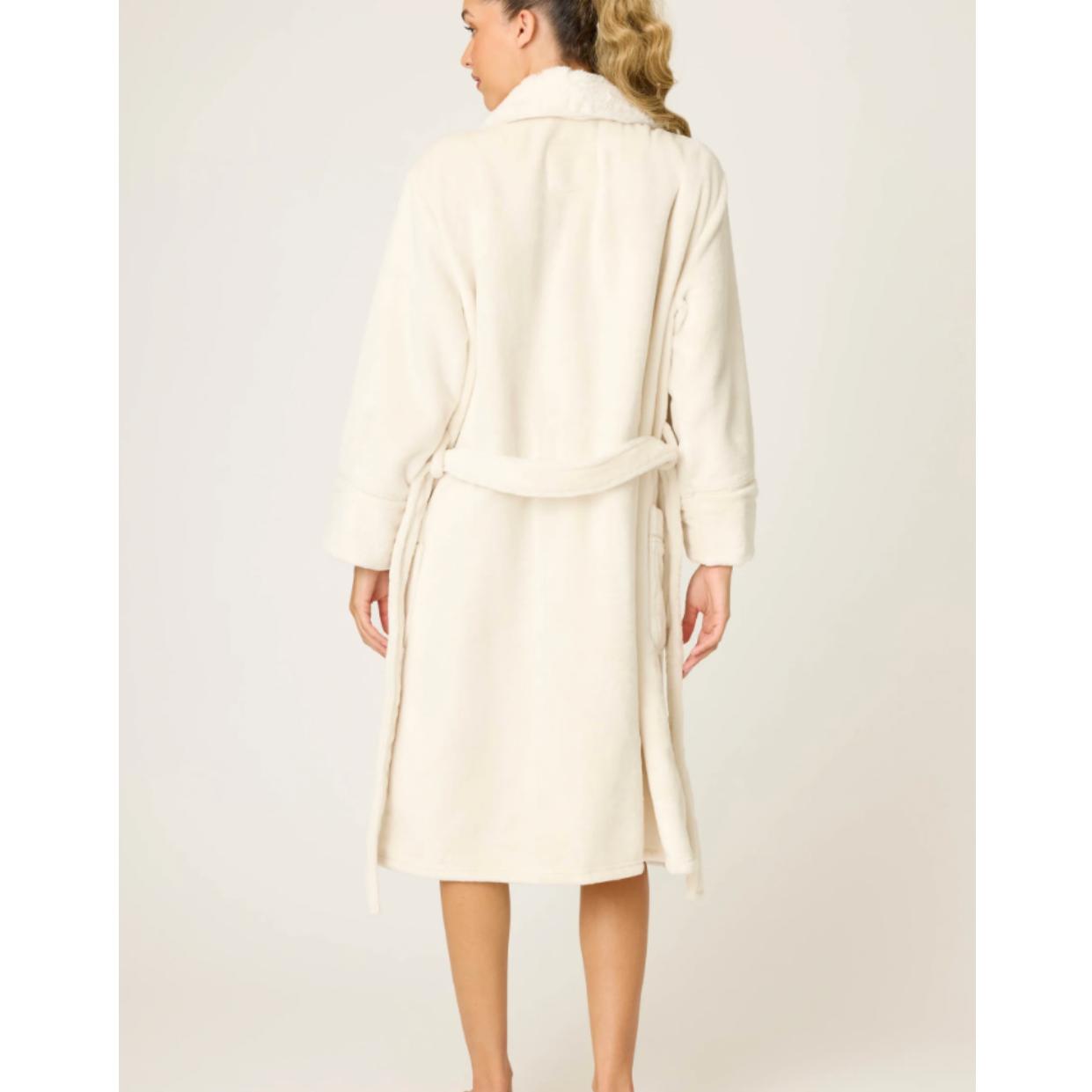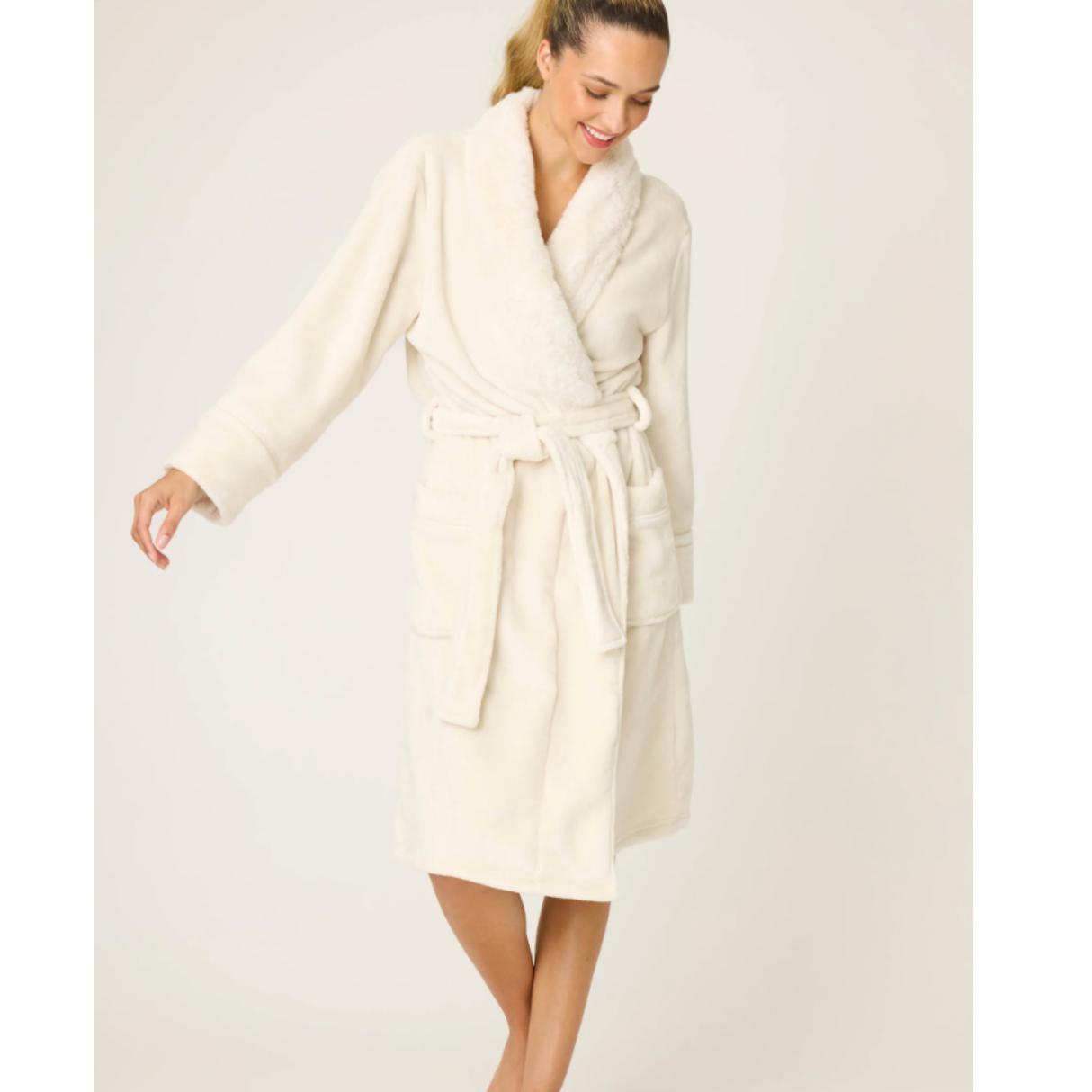 Meet your new favorite layering piece. This mid-length robe wraps you in sumptuous plush fleece that feels as good as it looks. The shawl collar adds an elegant touch, while the self-tie belt and spacious patch pockets keep things practical and put-together. In a versatile natural shade that works with any aesthetic, it's the cozy essential that never goes out of rotation. 100% polyester for easy care—machine wash cold, tumble dry low.